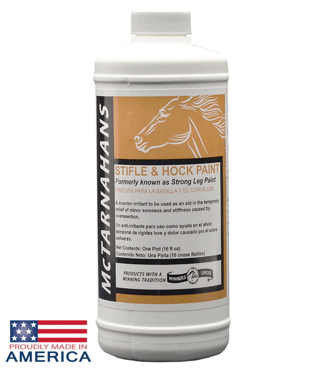 Stiffle & Hock Paint de McTarnahans est un contre irritant à utilise comme aide au soulagement temporaire des douleurs et des raideurs mineures causées par le surmenage.